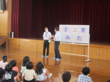 また、校外でも自分の身の安全を守れるように、不審者かどうかを判断する「さっきみた」という合言葉を教えていただきました。「さ」は「さわってくる」、「っ」は「連れていこうとする」、「き」は「聞いてくる」、「み」は「(見たくないものを)見せてくる」、「た」は「食べ物をわたそうとする」、以上のようなことをしてくる人は不審者であると教えていただきました。