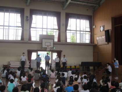 避難訓練の後、上京警察署の署長様や警察官の方に、身の安全を守るためのお話を聞かせていただきました。
