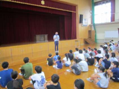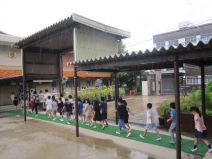雨が降っていましたので、今回は体育館へ避難しました。担当の教職員や学校長の話をしっかり聞き、地震発生時に自分の身を守るためにどのようにするのか、自分でしっかり考え判断することの大切さについて、確かめることができました。