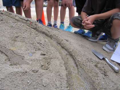 砂場の山に川をつくり、水を流すとどのような様子が見られるかを観察しました。流れが緩やかなところ、まっすぐのところ、曲がっているところの水の流れなどを観察し、なぜそのような様子が見られるのか、考えました。