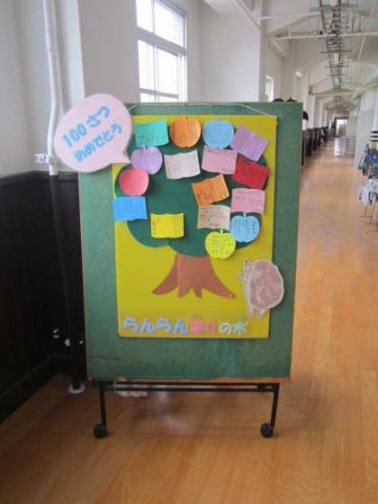 10月行事に合わせて、本のコーナーや展示が変わりました。図書館の入口にある「らんらん実りの木」には、100冊読書を達成した子どもたちの「実」が増えています。