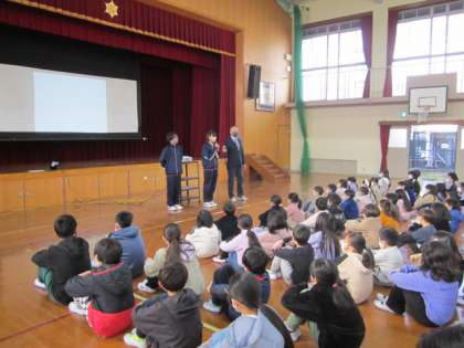 18日(水)の給食集会の前に、学校長から子どもたちへ2名の紹介をしました。2名の中学生は、3日間でがんばりたいことなど、みんなの前でしっかりと話していました。