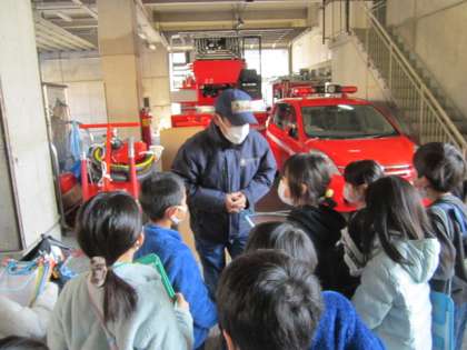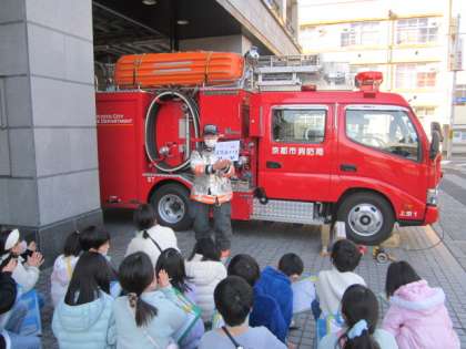 20日(金)に上京消防署へ社会見学に行きました。消防署の方にお世話になり、施設の見学をしたり、消防車のことについてクイズ形式で教えていただいたりしました。