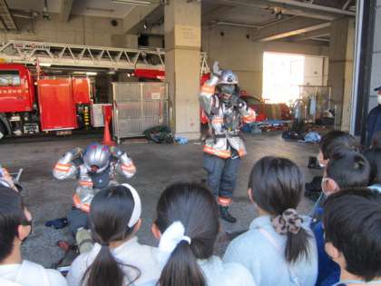 消防士さんが消火活動をするときに着る服や装備を見せていただきました。1分以内で全ての装備を身に付けるところを見せていただき、「すごい!!」と子どもたちは声をあげていました。