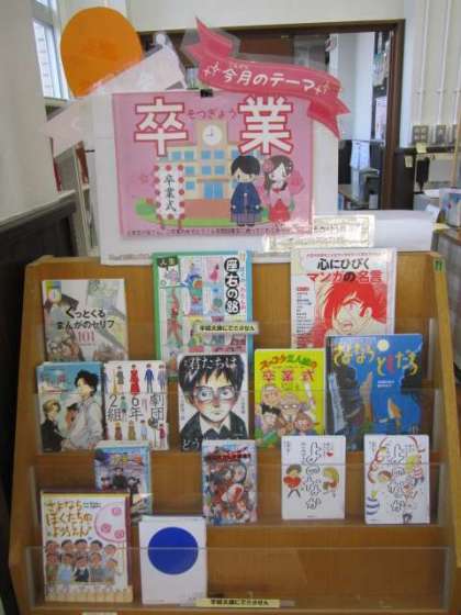 3月の図書館のテーマは「卒業」です。図書ボランティアのみなさんが、コーナーや展示をしてくださいました。いつもありがとうございます!!