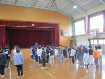 校長先生からの話を聞いて、1年間の活動を振り返りました。子どもたちは練習や活動をがんばったので、部活動を楽しむことができたようです。