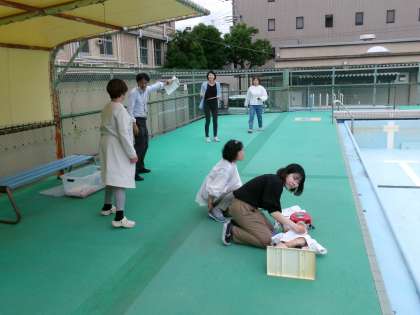 京都市では平成24年の市内小学校での事故を教訓にして、事故で亡くなられた児童のお名前を冠した「HANAモデル」という名称の実地訓練を各校で行っております。本校でも6月1日に水泳事故を想定した緊急対応訓練を実施しました。実際の場面を想定しAED使用、救急車要請など学校組織全体として対応できるよう訓練、振り返りを行いました。