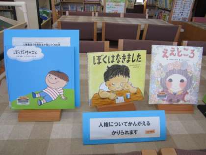 正親小学校の人権月間に合わせたコーナーも設置していただいています。昨日の人権集会で、学校長が読み聞かせをした本も、手に取って読めるようにしていただいています。
