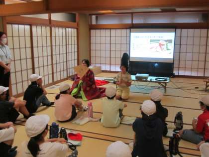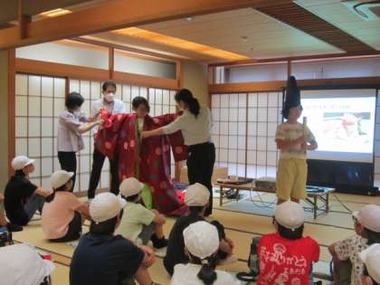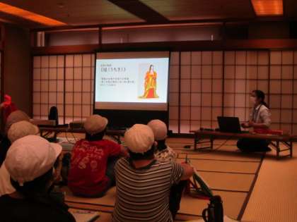 平安時代の装束の話を聞き、代表の児童が装束を着る体験をしました。