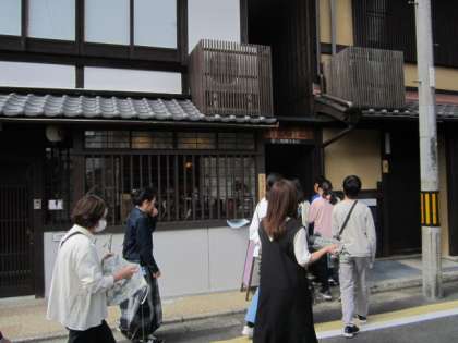 学校の近くの路地(ろおじ)や京町家を見ながら、京都の昔ながらの町や建物の特徴について教えていただきました。