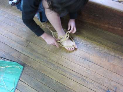 はいてみたり,わらを使って作ってみようとしたりしていました。