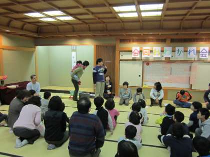 初めに,和室でみんなで歌を歌ったり,お別れの言葉を言ったり,プレゼント渡しをしたりしました。