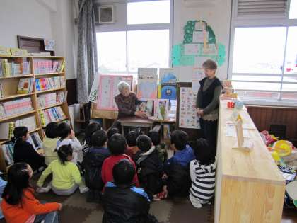 新しく整備された「お話のコーナー」を使っての読み聞かせです。