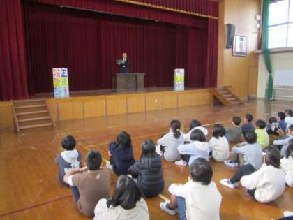 学校長より2つの話を聞きました。1つ目の話は、12月人権目標「情報の正しい使い方を知ろう」に関することでした。子どもたちの身近なところにある「タブレット」や「スマートホン」は生活を便利にしてくれるものであるが、使い方を間違えると「うその情報を信じてしまい、だまされることがある」という話でした。このようなことは「タブレット」や「スマートホン」に限らず、人と人との関わりの中にもあるということを聞きました。相手の人から他の人の悪口を言っているのを聞いて、その聞いた悪口を信じてしまい、また他の人に聞いた悪口を言うということがあった場合、それは間違ったことであり、間違ったことがあれば「正親勇」の心で、正しいことを、親切に、勇気を出して、相手の人に伝えてほしいという話でした。