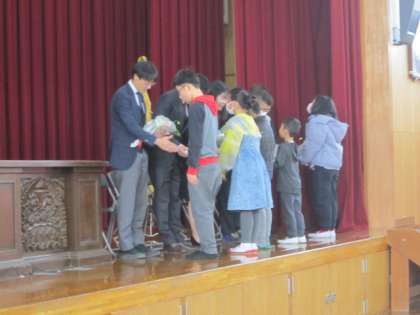 5年生代表児童5名が感謝の言葉を伝え、2年、3年、5年、6年(卒業生)の児童が花束をおくりました。