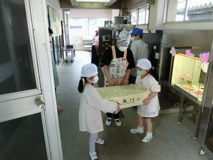 今日から給食が始まりました。1年生は、身支度や当番の仕事も覚えます。今日は初めてなので、4時間目から準備にかかりました。6年生も手伝いに来てくれました。入学祝献立の「スパゲッティのミートソース煮」は人気メニューで、ほとんど完食できました。