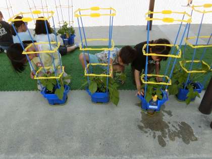 毎朝水やりをしているアサガオのツルが伸びてきました。1年生は、自分の鉢に支柱を組み立て、ツルがうまく伸びるように絡ませていました。また、アサガオの成長を支えるために追肥もしました。これからの成長が楽しみです。