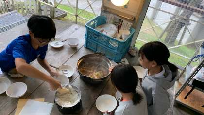 夕食のメニューは鶏すき焼き風煮です。火をおこして煮炊きするのに悪戦苦闘しましたが、全グループが美味しい鶏すき焼き風煮とご飯を完成させました。みんなでお腹いっぱいいただきました。