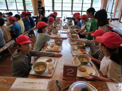 昼食は食堂でいただきました。きつねうどんとバイキングのおかずです。午前中にたくさん歩いたので、いっぱい食べました。