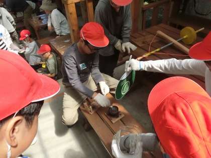 午前中は火おこし体験をしました。午後の野外炊事に使う大切な「火」です。最初は難しかったけど、だんだん慣れてきて、全てのグループが火をおこすことができました。