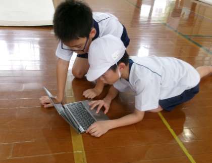4年生の体育では、マット運動の学習をしています。開脚前転や開脚後転、飛び込み前転などに挑戦しています。互いに動画を取り合って、自分の技を確認しながら取り組んでいます。