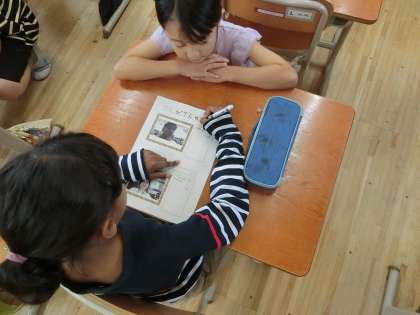 先日、ロイロノートで作った自己紹介カードを印刷し、名前やコメントを書き入れました。友だちと確認しながら、丁寧に書いていきました。