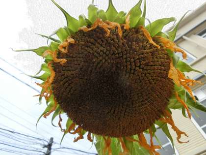 花壇のヒマワリやヘチマの変化にも気が付きました。ヒマワリの花は種を膨らませて重くなり下を向いています。ヘチマやゴーヤは実をつけています。季節は少しずつ秋に向かっています。
