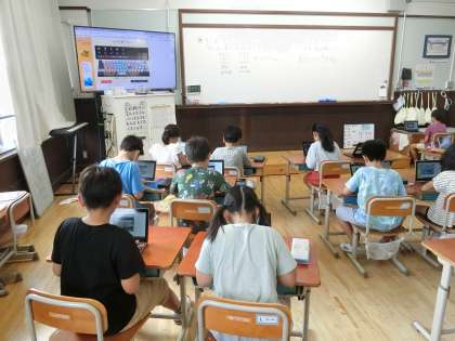 3年生はキーボードによる文字入力の基礎・基本の学習をしました。1年生以来、すわり方や鉛筆のもち方、3年生では毛筆のもち方、音楽では、鍵盤ハーモニカやリコーダーの指づかいなど、道具の正しい使い方を学んできました。GIGA端末も同じように正しい使い方を身に付け、学習道具として活用していきます。