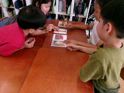 3年生は図画工作科の学習で,アートカードを使いました。1人1枚裏向きのカードを引き,「せーの」の合図とともに,みんなでカードをひっくり返します。グループの友達とお互いのカードをつなげて,お話の世界を想像しました。なかなか,共通点が見つからない絵もありましたが,有名な作品に触れながら,みんなで楽しみました。