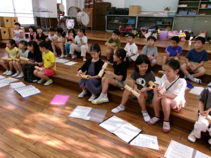 2学期始めてのふれあい音楽教室がありました。いつも歌っている「小さな世界」や新しい「アイスクリームのうた」などをみんなで楽しく歌いました。スズやウッドブロックを使って合奏もしました。みんなで歌ったり,演奏したりするのは心がほっこりするね。和やかな時間でした。