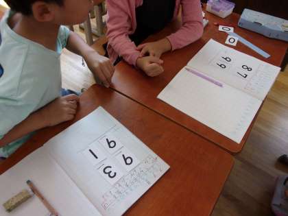 算数科「たし算とひき算のひっ算(2)」の学習で、数カードを使ってゲームをしました。1〜9までのカードを4枚ひいて、せーので答えを比べます。答えが大きい方が勝ちです。これまで学習したことを生かして、楽しみながら活動することができました。