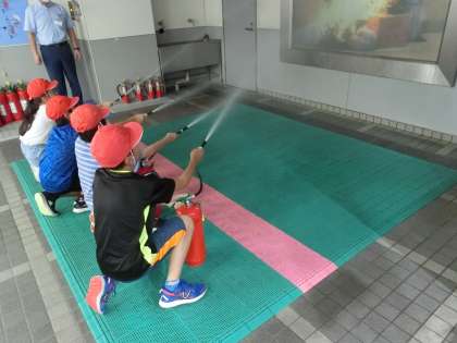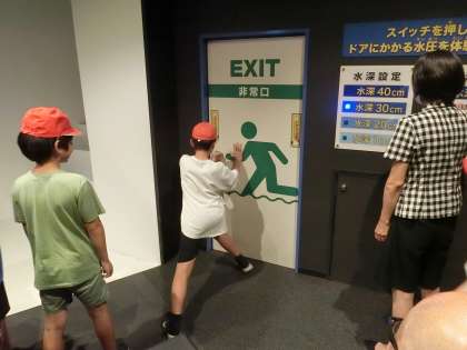 京都市市民防災センターで災害の恐ろしさや防災について、6つの体験プログラムを通して学びました。正親学区でも起こりうる災害の中でも、台風や火災の体験は印象に残ったようです。風速30メートルの風や、水深30センチメートル水圧でで全く扉が開かないことを体験しました。また消火体験では消火器の使い方を教わり、ビルの中で火災が起こった時の避難体験などをしました。