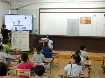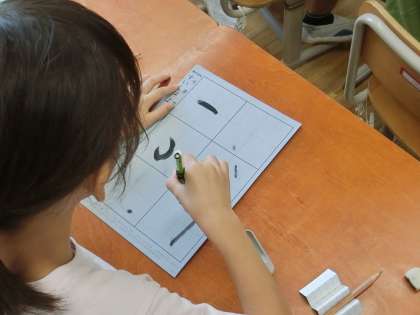 水筆を使って文字を書く学習です。鉛筆とはちがい、始筆や止め、はね、はらいなどの特徴が分かりやすく表れます。まだまだ慣れない筆に悪戦苦闘していました。