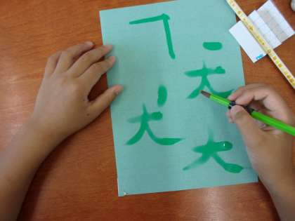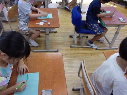 書写の学習で、水書用筆と水書用紙を使って活動しました。筆を使って字を書くと、力の入れ方や穂先の動かし方によって、線の太さや字の形が変わります。「力を入れると線が太くなる!」「優しく書くと、細い線で字を書けた!」「すぅっと書いたら、きれいに『はらい』ができた」など、いろいろな発見をしながら、楽しく学習することができました。