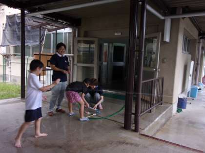 今日の外国語の時間は、外で水遊びをしました。ALTのカーメル先生や給食調理員さんにも参加してもらいとってもにぎやかな時間になりました。