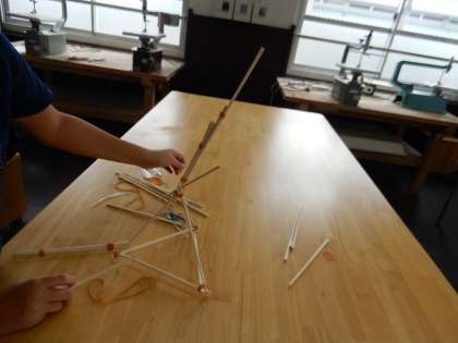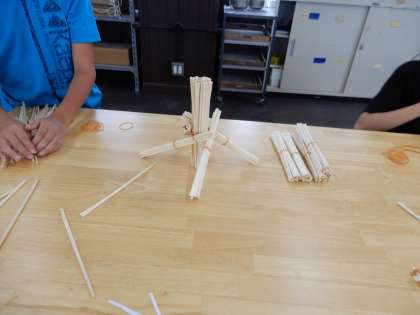 この単元では割りばしを輪ゴムやモールでつなげていき、いろいろな形を作っていくという活動をしています。