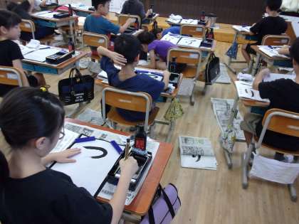 静かな教室で一画一画を丁寧に書いています。
