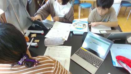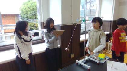 理科の学習でふりこのきまりを学習しています。ふりこが一往復する時間には何が関係するのか、条件を制御しながら、グループで実験をしています。ワークシートとICTを使って実験の結果をまとめています。実験を通して何が関係するのかきまりを見つけられたかな。