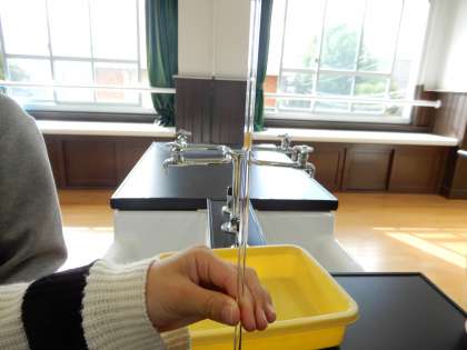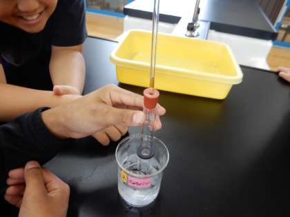 4年生の理科では「ものの温度と体積」の学習を進めており、今回は実験を行いました。ガラス管にゼリーを入れ込み、試験管につなげます。試験管を温めたり冷やしたりすることで、試験管の中の空気の体積がどう変わるかをゼリーの動きで観察する実験です。冷やしたり温めたりすることでゼリーが上下する様子を見て、子どもたちは空気の体積が変わったことを実感していました。