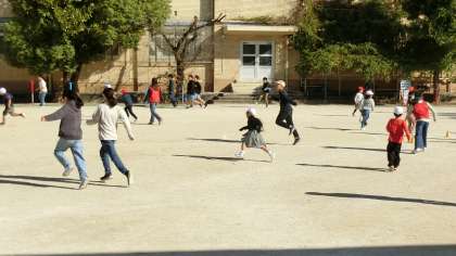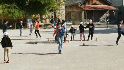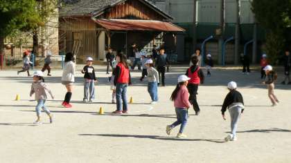 午後のチャレンジタイムの時間に1年生と6年生が運動場でおにごっこをしていました。6年生は走る代わりにスキップで、1年生はそのお兄さん、お姉さんを全速力で追いかけていました。秋晴れの空のもと、笑顔があふれる運動場でした。