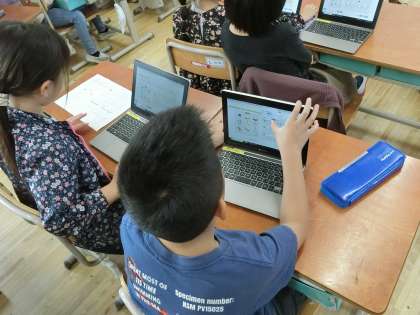 GIGA端末を使って、色々な楽器でリズムをつくり2人でお話ししているようにつなげる学習をしていました。「おはよう!ーおはよう!」「元気?−元気!」のように呼びかけに対してこたえるようにリズムで対話をしていました。