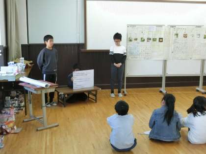 4年生は総合的な学習で蚕の成長から様々なことを探究してきました。学習してきたことを3年生に伝えるために、模造紙でまとめたり、クイズをつくったり、寸劇したりして発表する準備をしています。今日は、これまでお世話になった衣笠繊維研究所の先生に来ていただき、発表の内容な方法についてアドバイスをいただきました。