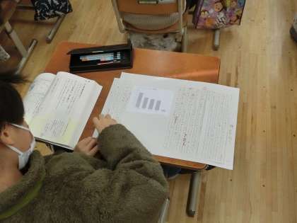 環境問題をテーマに、資料を用いて自分の考えが伝わるように工夫して文章を書いています。何度かの書き直しを経て、これから清書に向かいます。