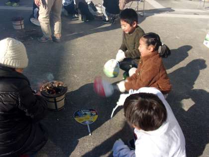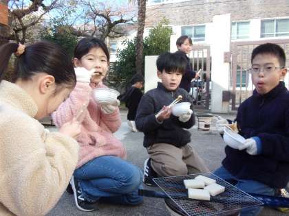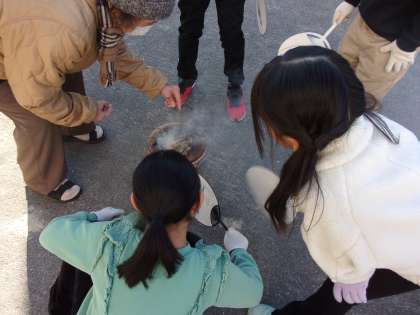 社会科で学習した、昔の道具 七輪を体験しました。地域の方々に教えていただきながら、火おこしに挑戦しました。始めはなかなか火がつかず、苦戦していましたが、みんなで力を合わせ、お餅を焼くことができました。