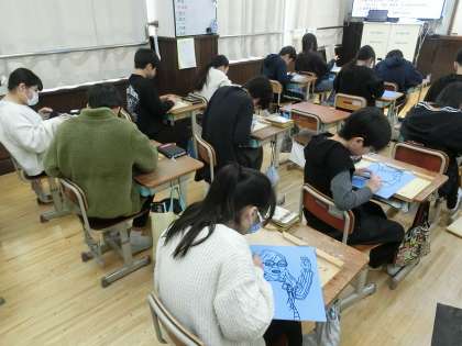 学級閉鎖だった6年生が登校を再開しました。2月の図工展に向けて、一心不乱に彫刻刀で彫進めています。