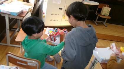 持ってきた箱に何を入れたいか、どのように飾るとよいかを考えて、自分だけの「たいせつボックス」を作りました。形や色、材料を考えながら工夫して箱を飾ったり、中に入れたいものを作ったりして、素敵な宝箱ができました。友達と見せ合って、楽しみました。