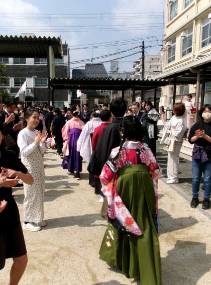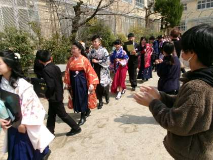 最後の花道を通る卒業生の表情はとても晴れやかで、未来に向かって巣立っていく子どもたちの姿は、見送る私たちに喜びと感動を与えてくれました。これまでお子達を支え、育ててこられた保護者の皆様、地域の皆様に、心からお慶び申し上げます。本日は、ご卒業おめでとうございます。