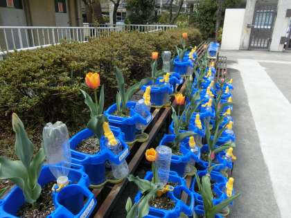 ようやくチューリップの花の色が分かりました。単色かなと思っていたら、オレンジとピンクの混ざったきれいな花が咲きました。この花も入学式を飾ってくれます。