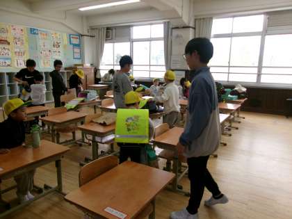 まずは、例年のように下駄箱の前で朝早くから6年生が1年生を出迎えてくれました。教室でどのように学習の準備をするのか、先生がホワイトボードに書いた説明を見ながら、丁寧にサポートしてくれていました。
