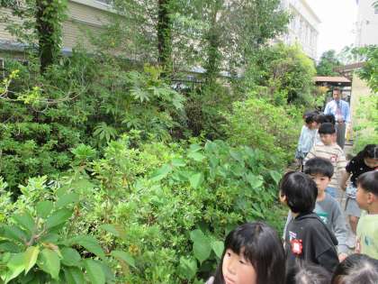 生活科の学習で、校内を探検しました。この日は、運動場や畑を見に行きました。「池にカエルがいた!」「アリの巣がある!」「お花がきれい!」など、いろいろなものを見つけました。